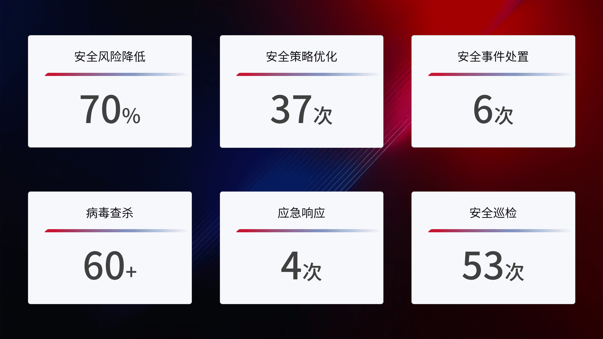 提供全面的安全事件报告体系,,包括处置报告、、、周报、、季度和年度总结,,,结合持续监控,,,,帮助客户深入了解网络安全状况。。。