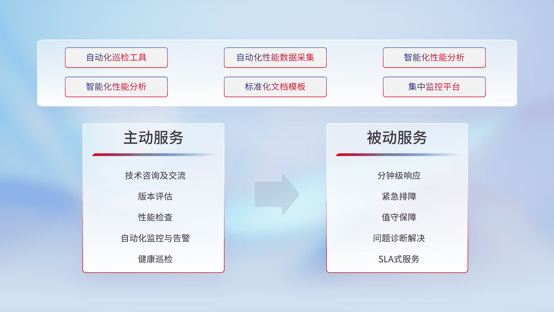 智能化工具和标准化文档,,,,保障服务质量,,提供主动服务(包含技术咨询、、、、版本评估、、、性能检查、、自动化监控与告警、、、健康巡检)和被动服务包含(分钟级响应、、、、紧急排障、、值守保障、、、、问题诊断解决、、、、SLA服务)。。。